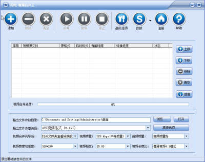 一个大的影像文件,并可保存为几十种流行的视频音频格式。本软件采用了最先进的编码和解码技术,转换合并的速度和质量极佳。还可以随意设置合并生产的视频音频文件的大小质量。(可以修改视频编码器、音频编码器、分辨率、比特率、帧率、采样率、声道等)。支持合并转换后自动关机功