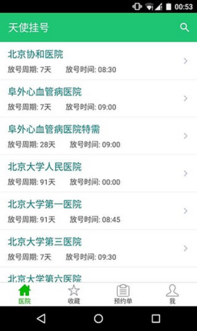 天使挂号是北京市最好用的移动挂号APP,没有之一!可以挂号、抢号、监控,还能显示医生姓名和专长,动动手指轻松搞定北京市150所医院的各种热门号源,下载、使用全免费哦!协和/同仁/阜外/北医三院/北大口腔医院/广安门医院/海军总医院/儿童医院等医院的热门号源都不在话下!