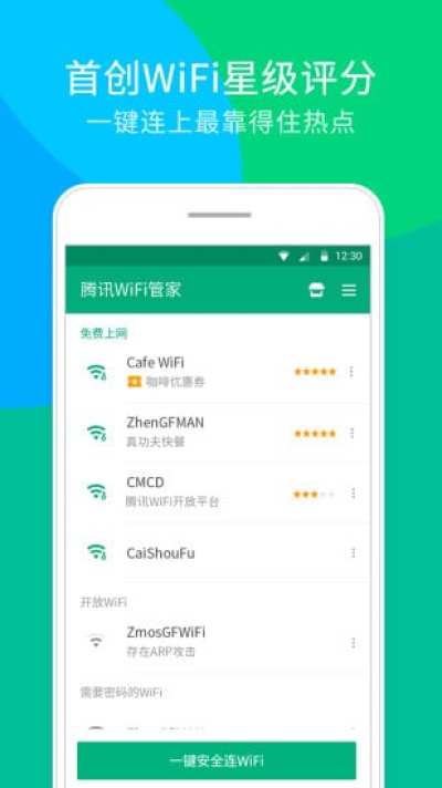 腾讯WiFi管家这款APP可以看做是腾讯手机管家安卓版的“免费WiFi”功能的升级版,,可以搜寻附近的免费WiFi,并一键连接上网。腾讯的免费WiFi热点主要为公共WiFi,总数超过1亿。
