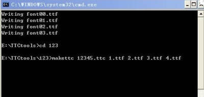 将ttf文件放入makettc.exe所在目录,然后在命令行窗口转到到此软件所在的目录,输入如下命令makettc TTC字体文件名 TTF字体文件名,回车即可。如果TTF文件有多个,则它们之间用空格分隔
