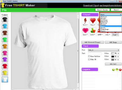 感觉现在的单色T恤都很单调,没啥特色,我们可以自己设计T恤啊,Free TSHIRT Maker就是一款免费的T恤图案设计软件,软件内置了各种颜色的T恤模板,同时您可以添加文字到T恤,添加的文字支持颜色、描边等设置,另外软件还内置了丰富的图案库,包括武器、笑脸、小动物、创意设计图案等,都可以添加到T恤上边。