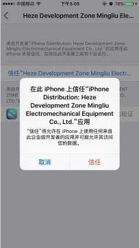 这个时候,你需要进入“设置>>通用>>描述文件”找到如下图所示的海马苹果助手描述文件,点“信任”之后才能够正常打开海马苹果助手IOS版。