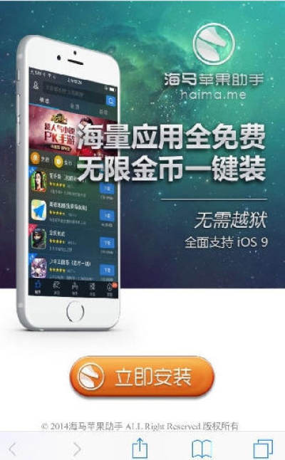 同学们请注意,海马苹果助手已经开始支持IOS 9系统,越狱非越狱用户都可以直接在线安装,海马苹果助手IOS版本。不过大家需要注意的是,IOS 9系统安装完毕之后会提示“未受信任的开发者应用”,而且没有信任摁钮供大家确认。