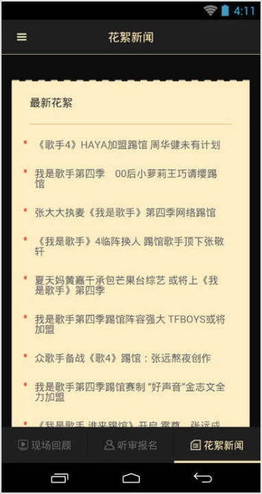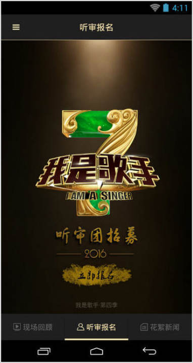 《我是歌手》第四季官方报名APP,提供第一手《我是歌手》节目资讯。
