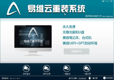 易维云重装系统是最容易的系统维护工具,傻瓜化系统安装软件,首个完美支持MBR分区,UEFI_GPT分区的系统安装软件。无需任何工具,无需去电脑店,无需时刻盯牢电脑,只要一个高速的网络,就能帮你实现快速装机。可以在Windows平台下互换系统,下到Win XP ,上到Win10;可自动检测运行环境,支持台式机,笔记本,品牌机,一体机。