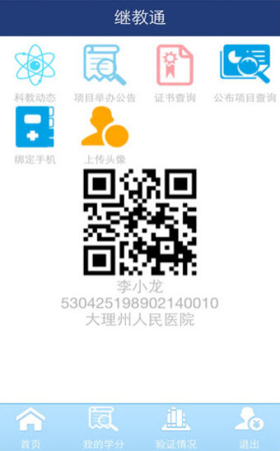 系统主页面分为科教动态、项目举办公告、证书查询、公布项目查询、绑定手机、我的学分、验证情况、学员二维码。