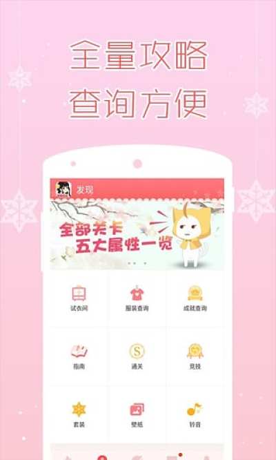 ---【发现】<试衣间>随时随地模拟试衣;<服装查询>服装数据一手掌握;<成就查询>成长旅程了如指掌;<通关指南>最全通关攻略指南;<精品展示>周边小说、绘画、COS等你来看;壁纸铃声应有尽有,更有福利惊喜等你发现…最全面的攻略,多维度多方案供你选择。