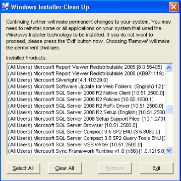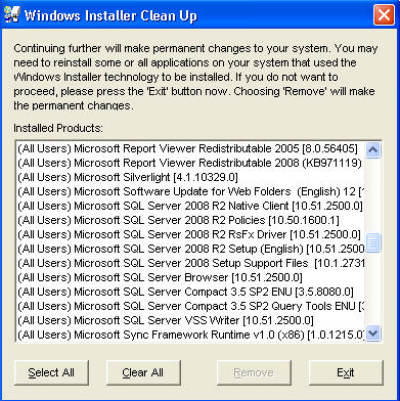 1)使用工具软件“Windows Install Clean Up” 来完成SqlServer2008的完全卸载工作,这个工具确实很方便,能够卸载掉“添加/删除”工具中无法卸载的软件;