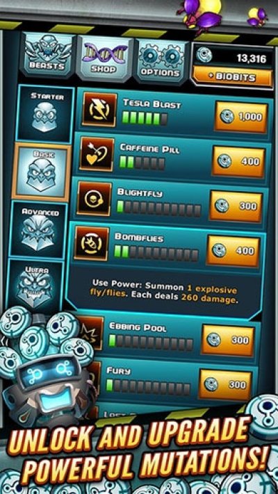 生化野兽是一款非常好玩的动作类手机游戏,游戏整体采用街机风格,游戏中玩家需要操控一只变异怪兽,在不断逃避追捕时,还要消灭敌人,多种关卡挑战,另外还有着独特的升级系统。