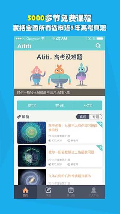 爱提提高考APP是一款由专业的高考培训网站爱提提高考推出的官方手机客户端应用。app界面很精致,中间有数理化三个科目选择首页有重点知识点和专题的推荐。