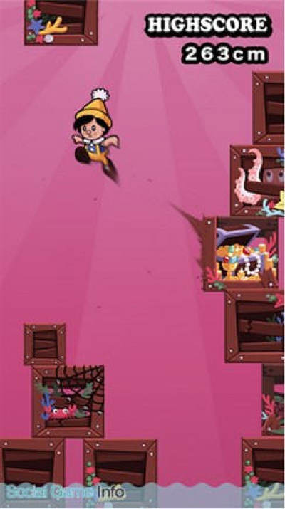 在跳跃过程中,玩家还需要留意上方掉下来的木箱,以及下方不断逼近的海水。路程总共有10000cm,跳的越高游戏难度也越大,匹诺曹能否脱逃成功就要看玩家的本事了。