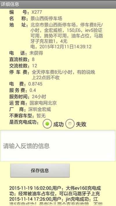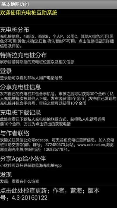 本程序是一个充电桩互助分享软件。在中国,低碳环保的电动汽车刚刚起步,充电桩还很少,希望大家积极贡献自己的充电桩信息,也可以贡献自己知道的商家的充电桩信息,我们的目标就是开着电动车走遍全中国。