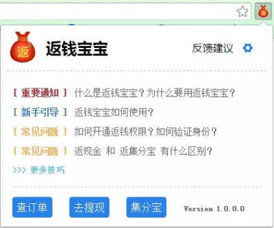 返钱宝宝是专为网购用户打造的购物返利插件。返钱宝宝是基于网页辅助的浏览器插件。用户需要在浏览器上安装返钱宝宝返利插件,用户在网页在线购物时候,返钱宝宝就会进行返利,而且支持提现,且不向用户收取一分钱!最轻便的购物返利工具!需要的朋友可以下载体验一下。