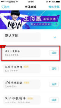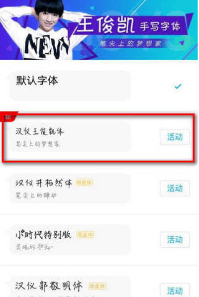 王俊凯字体是内置在手机qq字体商城里面,进入手机qq之后,点击个性装扮,选择聊天字体,进入之后会发现汉仪王俊凯体,然后点击“活动”进去,用户只需开通或续费至少一个月的会员服务,便可以使用本字体。