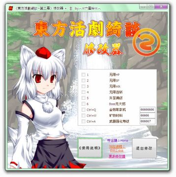 东方活剧绮谈第二幕是东方系列的一款同人游戏,也是该系列第二部作品,游戏带有升级系统、气力系统、装备系统、精炼系统以及擦弹(Graze)系统,丰富好玩,极杀时间!东方活剧绮谈第二幕修改器为玩家准备了九项功能,都是一些非常强大的功能,开启后分分钟过关,什么BOSS都不再话下。