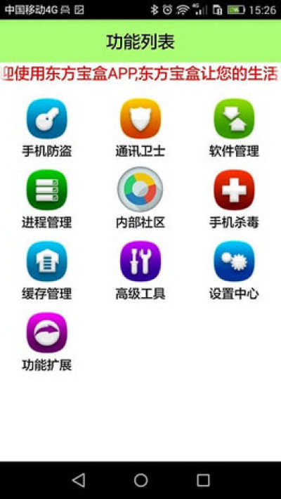 东方宝盒为广大用户提供手机防盗、通讯管理、软件管理、进程管理、内部社区、手机杀毒、缓存管理、号码归属地查询、短信备份与恢复等等实用的功能,东方宝盒让您的生活更加方便!