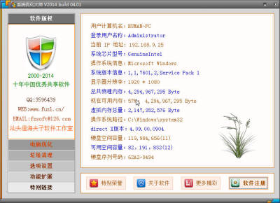 系统优化大师是一款简单实用的系统优化工具;软件全方位、高效、安全地提高你的系统性能,软件使用简单,界面友好,傻瓜式操作,使用本软件可能迅速达到系统优化目的。包括桌面优化、菜单优化、网络优化、软件优化、系统优化以及禁用设置、选择设置、更改设置等一系列个性化优化及设置选项。软件可以进行高速的注册表清理及高速的硬盘垃圾文件清理,清理全面、安全、不影响任何运行性能。