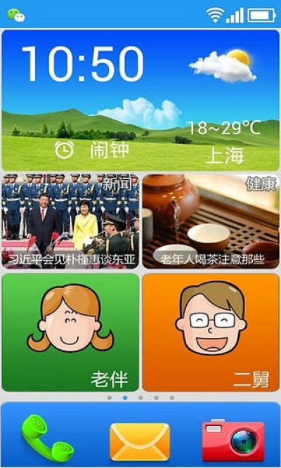 专为爸妈设计的桌面,大字体、大图标,大色块,无论短信、通讯录一律超大,让爸妈扔掉老花镜。