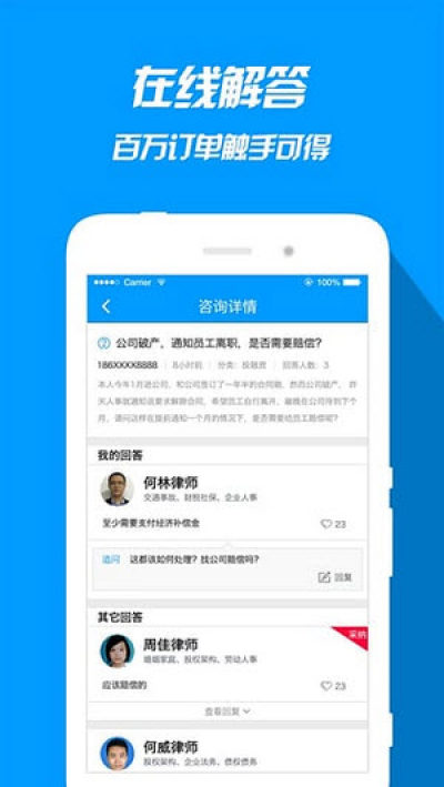这是红帽法律卫士的律师端,律师朋友可以通过它来快速获取同城客户,同时还可以用它来在线回答客户提出的各种法律问题,拉近与客户之间的距离,功能非常全面,律师朋友必备哟!
