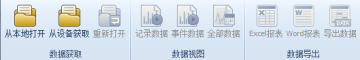 1、数据获取:完成获取、打开并分析统计数据文件、选择时间段数据的功能,包括“从本地打开”、“从设备获取”、“重新打开”;