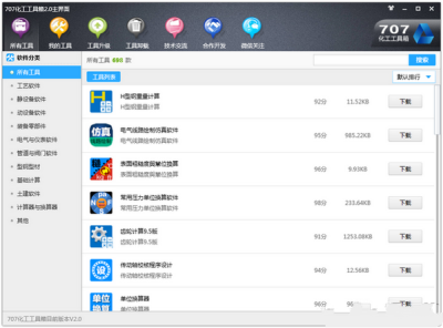 707化工工具箱是一款解决化工从业人员需求而开发的辅助工具,包括软件下载、技术交流、合作开发三大功能,有了它可以不用到处去找化工相关的软件下载,将下载使用保存升级全部整合在本工具箱中。