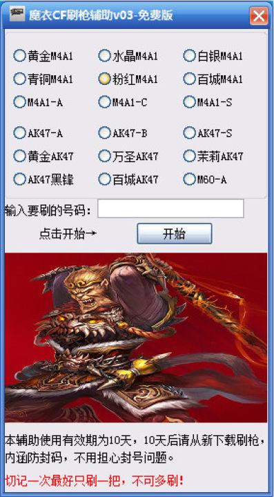 魔衣CF刷枪辅助工具,主要可免费刷取黄金M4A1、水晶M4A1、白银M4A1、青铜M4A1、粉红M4A1等枪只,喜欢玩CF的朋友可以下载使用。