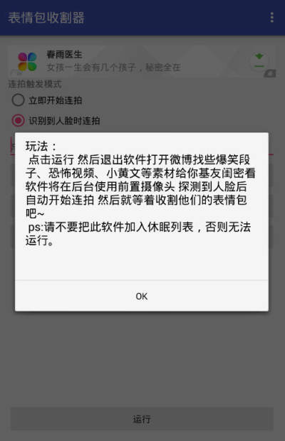 表情收割机可以在后台使用前置摄像头 探测到人脸后自动开始连拍,试用于偷偷捕捉朋友面对手机时的表情变化。配合微博等内容app捕获你想要的任何表情!全程隐蔽拍摄,被拍者无法发现~但是请小心使用。