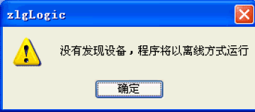 果您的PC没有连接逻辑分析仪,则会出现如下图所示对话框,提示您没有连接好,选择“确定”后仍可以进入zlgLogic软件界面,只是应用程序右下角提示为离线状态。