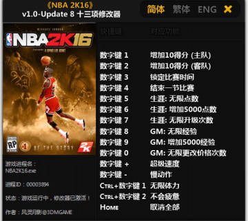NBA 2K16最新十三项修改器,包括了自己刷得分,锁定时间,无限点数等功能,让你想怎么玩就怎么玩,让你的队伍瞬间成了联盟第一的队伍。