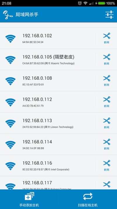 局域网杀手,功能和wifikill差不都,主要可切断同一局域网内任意电脑、手机等网络连接的工具,有需要的朋友可以下载到手机使用。
