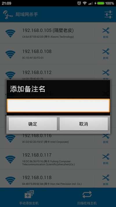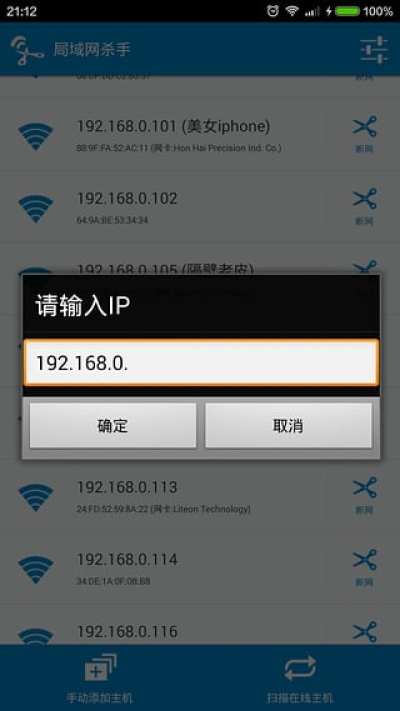 2.扫描主机列表速度因手机性能而定(一般10秒左右),可能会比较慢,请耐心等待。当然你还可以手动添加主机IP