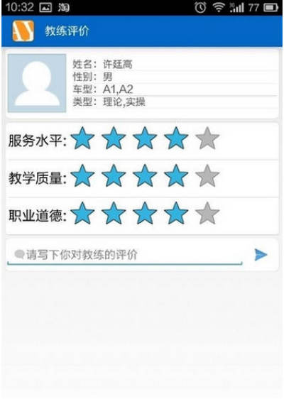 4.点击一条学时明细后的气泡按钮进入该条学时教练评价页面,完成教练星级评分和评语填写后,点击蓝色箭头保存该条学时教练评价