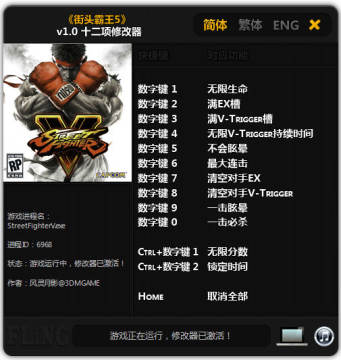 街头霸王5修改器(12项属性修改)下载,适用于街头霸王5游戏,如无意外全部或部分功能也会支持其他后续版本。