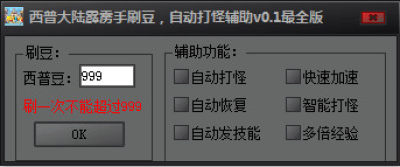 西普大陆霹雳手刷豆自动打怪辅助,主要支持自动打怪、自动恢复、自动发动技能、快速加速等实用功能,喜欢玩西普大陆的朋友可以下载使用。