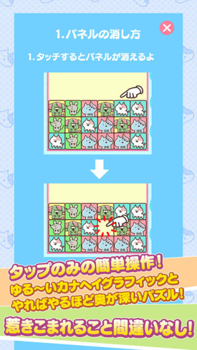 本作是改编自动画《恐怖!僵尸猫》的消除手游,当点触消除后方块会从屏幕下方向上涌现,如果超过最高的限界线会Game Over,时间则没有限制,共有30种任务供玩家挑战。