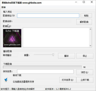 果核Echo回音下载器是一款由果核工作室推出的绿色小巧的Echo回声音乐下载工具,用户只需输入歌曲ID或地址即可在线试听和下载(音乐播放基于bass下载,下载基于迅雷云开发平台);操作简单,功能实用,需要的朋友可以下载体验一下!
