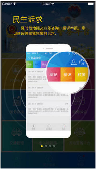 3.客户端以“随身携带、随时在线、随心服务”为目标,推出民生诉求、服务大厅、9600110热线、服务指南、在线查询等栏目,充分发挥新技术、新媒体在民生警务工作中的作用,