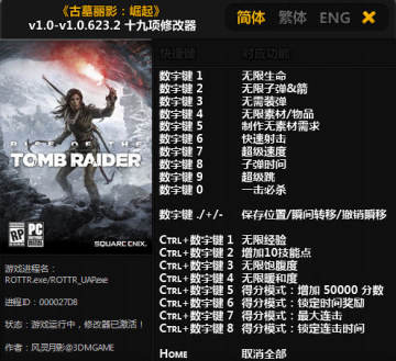 古墓丽影崛起的最新19项功能修改器,包括了绝大多数有用功能以及一些比较娱乐的功能,相信能够满足大部分玩家的需求,觉得有帮助的小伙伴可以试试看。