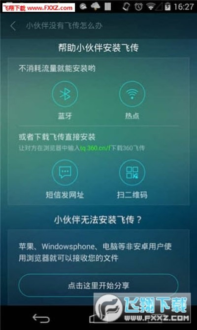360飞传是一款Android平台的手机文件零流量分享工具软件。通过终端自建热点的方式完成与其他终端间的文件传输,用户无需开启WIFI,更不会耗费用户的蜂窝数据流量,就可以完成终端间文件的传输。