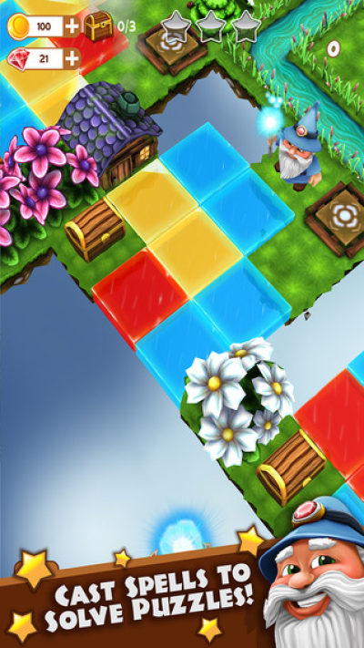 玩家将帮助大巫师通过点亮不同方格的色彩,让相同颜色的土地连成一片可通行的道路,达到光之门。要注意利用好有限的色彩魔法石,并在途中收集星星和金币,保持完美状态通关。