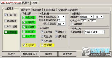日常任务设置:糖果传奇盛世辅助工具的主面板,可以选择日常任务、练级喊话和BOSS报时。糖果传奇盛世辅助工具的日常任务,可以挂机升级,功勋除魔、材料副本、塔防封魔、矿洞挖矿和个人BOSS。
