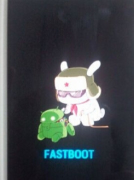1、接下来手机要进入FastBoot模式,进入的方法:在手机关机状态下,按住音量键-和电源键,当屏幕中出现一只米兔正在修安卓机器人则已经进入FastBoot模式,如下图所示: