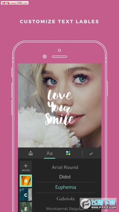 POTO提供清爽的字体的手工挑选,并允许范围广泛的编辑选项:旋转,缩放,改变颜色,添加多个文本。