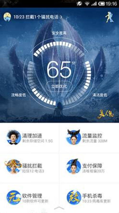 这些人物还分别掌管不同职能,邓超在清理加速、林允在监控流量、罗志祥在拦截骚扰、张雨绮在保障支付、软件管理和手机杀毒图标则分别为“无”和“敌”两个字,让用户在感受星爷无厘头的同时,为手机进行从内到外全方位的保护。