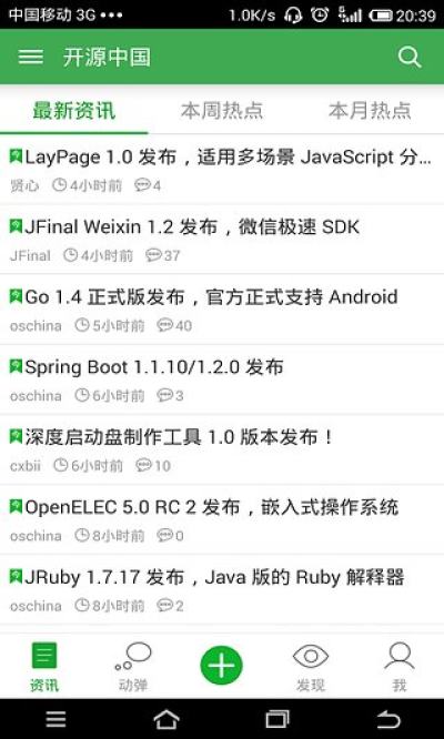 开源中国客户端为用户提供了新闻,问答,动弹,动态以及消息中心的快捷操作方式,让用户能随时随地的在开源中国社区上与其他朋友互动
