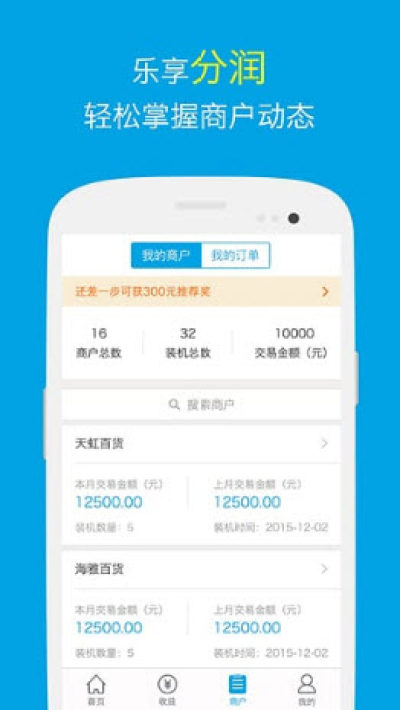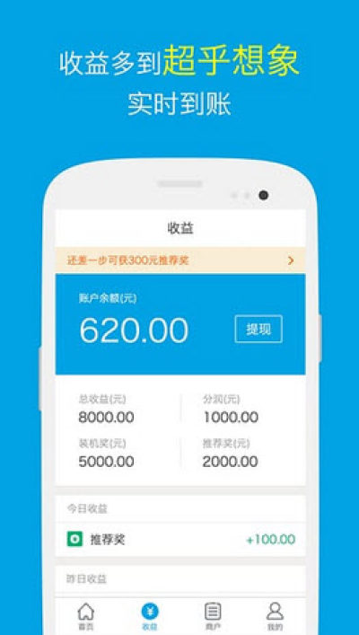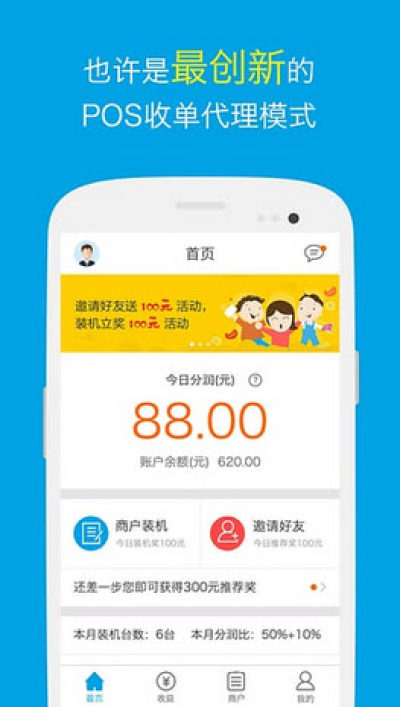 分润收益:POS机安装成功后,可长期享受商户刷卡手续费分润。