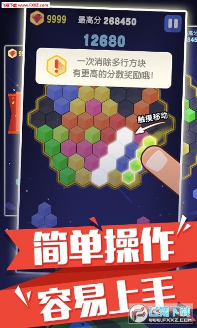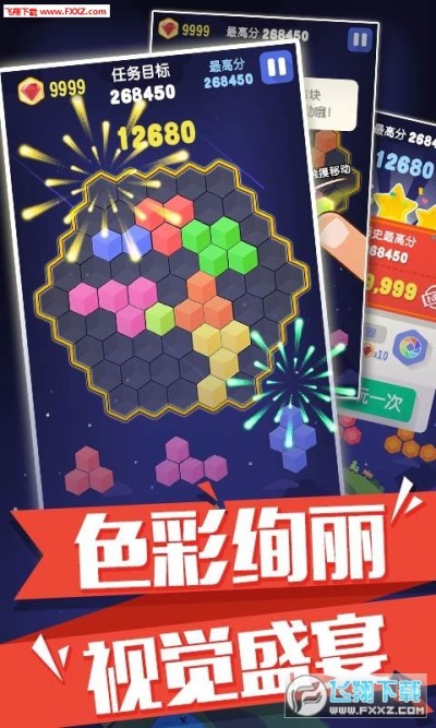 而连续消除会有额外Combo加分。棋盘上再也无法摆下任意一个六边形组合的时候,游戏就会失败,游戏规则简单,但趣味无穷。