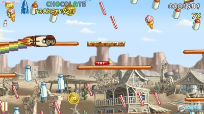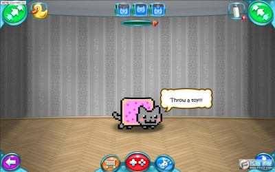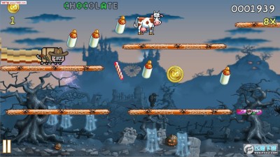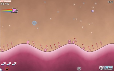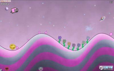 游戏中有着欢快有趣的形象和动作,并且带着2D像素风格的画面。配合上那首从头到尾都是“Nyan”的曲子,绝对是洗脑度十足。游戏的操作是简单直观的触屏形式,单击屏幕跳跃,双击可以二连跳。获得火箭超人等道具可以飞行的时候,直接按住屏幕然后移动自己的手指是控制飞行方向。玩的时候我们要做的就是不断的去收集各种蛋糕、牛奶、点心糖果,并且避开黑猫、飞碟、狗狗等等危险的家伙。