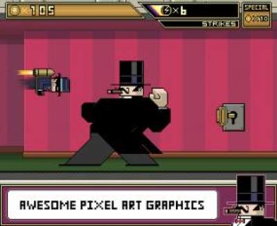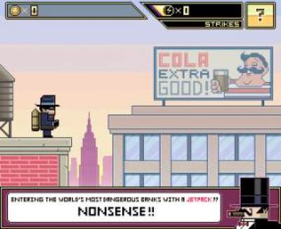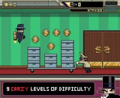 火箭盗贼(Jetpack Gangster : Billy Sky')是一款像素风格的虐心小游戏。游戏玩法稍有类似flappy bird。游戏中,玩家控制装备着火箭的盗贼入室盗窃,还得不断躲避来自警察的追捕。点击左键飞行,点击右键冲刺,玩起来非常的有意思。喜欢这类带有虐心色彩的玩家千万不要错过哦。