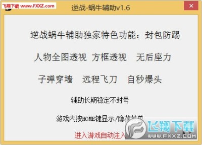 逆战蜗牛辅助,主要可向玩家提供方框透视、自瞄爆头、超级加速、远程飞刀、全图透视等多项辅助功能,有需要的朋友可以免费下载使用!